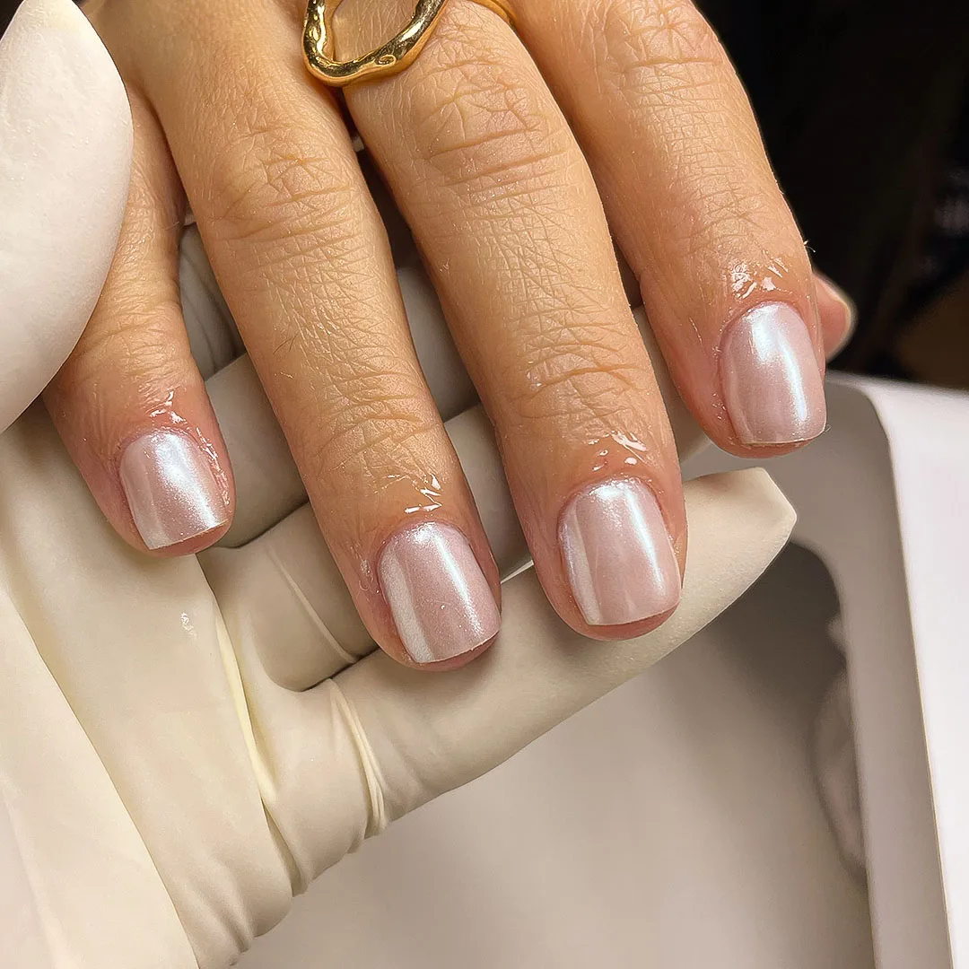 Uma camada fina e nivelada é aplicada sobre a unha — completamente transparente.